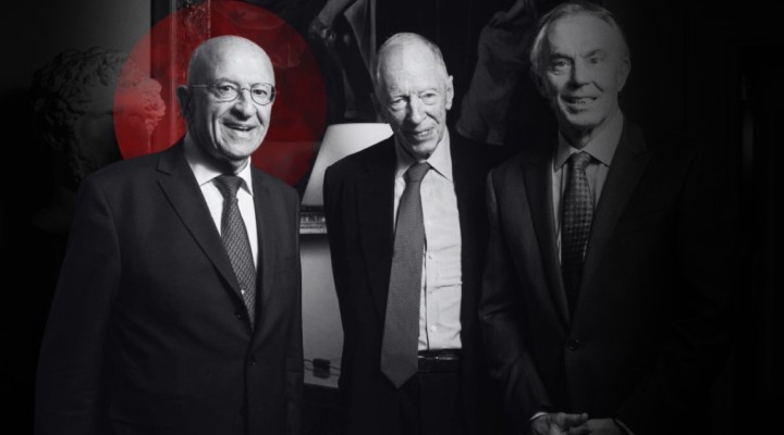 Feature photo | Sir Trevor Chinn (left), pictured alongside Jacob Rothschild (center) and former British Prime Minister Tony Blair (right) | Editing by MintPress News