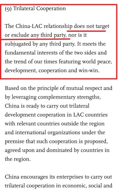 ▪️It emphasizes that China’s approach does not seek to exclude third parties outside Latin America (including the US) nor will tolerate any third party attempting to exclude China from cooperation with Latin America;