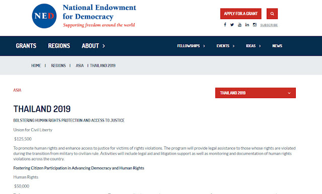 Thailand’s current protest’s core leadership includes the recently arrested Anon Nampa, a lawyer working for Thai Lawyers for Human Rights (TLHR) funded by the US NED via the Union for Civil Liberty. It was previously listed individually on the NED’s website in 2014 – archived here.
