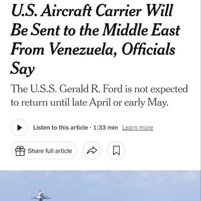 NYT reports carrier group used to overthrow/rob Venezuela in Western Hemisphere is now heading toward Middle East for US war on Iran.