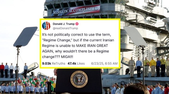 Secondly, Trump’s endorsement of regime change comes hours after officials from his own administration asserted emphatically that the president is not seeking regime change in Iran. Vice President JD Vance told the press that the administration “has been very clear that we don’t want a regime change,” and Defense Secretary Pete Hegseth said Trump’s aggressions toward Iran are “not about regime change” — only to have Trump grab his phone and immediately turn them into liars.