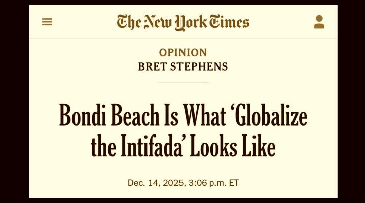New York Times warmonger Bret Stephens penned an article titled “Bondi Beach Is What ‘Globalize the Intifada’ Looks Like,” arguing that the shooters “were taking to heart slogans like ‘resistance is justified,’ and ‘by any means necessary,’ which have become ubiquitous at anti-Israel rallies the world over.”