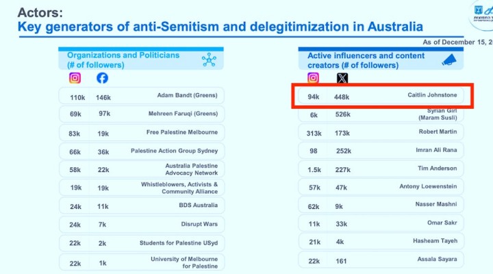 Page five of the document is titled “Actors: Key generators of anti-Semitism and delegitimization in Australia,” where the name Caitlin Johnstone is listed at the top of a column titled “Active influencers and content creators” which is ranked by number of followers. Page seven describes me as an “Anti-Western blogger, promoting conspiracies and complete delegitimization of Israel.”