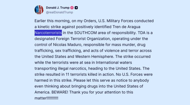At the same time, the Trump administration is defending its assassination of a boat full of Venezuelans on the allegation that they were “narcoterrorists”, an imaginary category designed to lump garden variety drug traffickers in with suicide bombers and mass shooters.