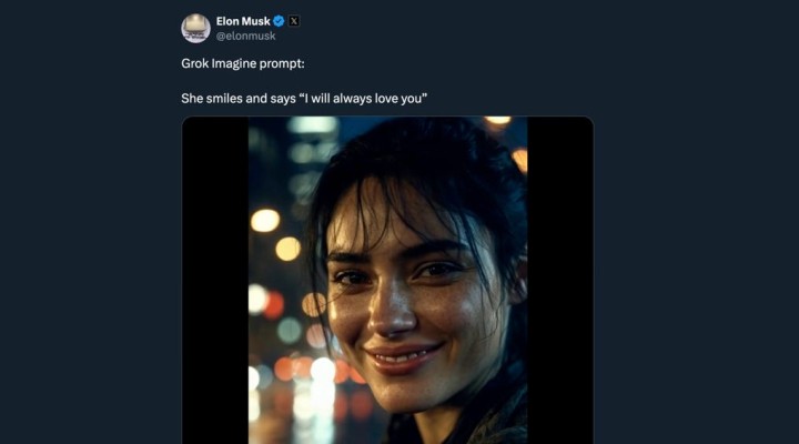 Pentagon contractor Elon Musk, currently the richest person alive, has posted a video clip showing off how people can use his AI video generation tool Grok Imagine to create the image of a woman’s face saying “I will always love you.”