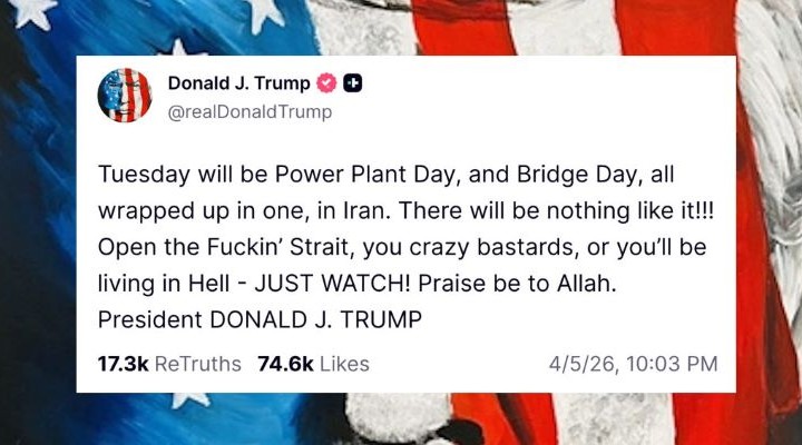 The president of the United States has a bat shit crazy post on Truth Social once again threatening to blow up civilian infrastructure in Iran, saying, “Tuesday will be Power Plant Day, and Bridge Day, all wrapped up in one, in Iran. There will be nothing like it!!! Open the Fuckin’ Strait, you crazy bastards, or you’ll be living in Hell — JUST WATCH! Praise be to Allah. President DONALD J. TRUMP.”