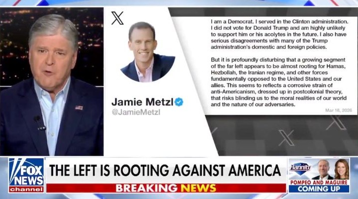 I saw a clip of Fox News war propagandist Sean Hannity solemnly reading a tweet by Atlantic Council fellow Jamie Metzl which said, “It is profoundly disturbing that a growing segment of the far left appears to be almost rooting for Hamas, Hezbollah, the Iranian regime, and other forces fundamentally opposed to the US and our allies. This seems to reflect a corrosive strain of anti-Americanism dressed up in post-colonial theory that risks blinding us to the moral realities of our world and the nature of our adversaries.”