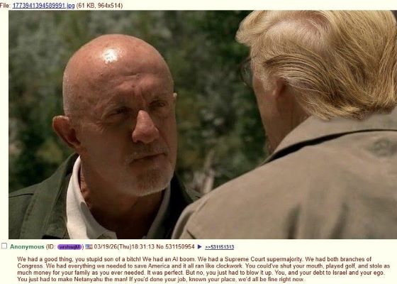 “We had a good thing, you stupid son of a bitch! We had an Al boom. We had a Supreme Court supermajority. We had both branches of Congress. We had everything we needed to save America and it all ran like clockwork. You could’ve shut your mouth, played golf, and stole as much money for your family as you ever needed. It was perfect. But no, you just had to blow it up. You, and your debt to Israel and your ego.