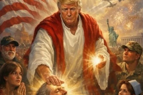 Il publie également une image de synthèse réalisée par Nick Adams, le président de la Foundation for Liberty and American Greatness (Fondation pour la Liberté et la grandeur de l’Amérique). On le voit en Jésus guérissant un malade, sous les yeux émerveillés de ses fidèles et la protection de ses soldats et de ses anges. C’était le jour de la Pâque orthodoxe.