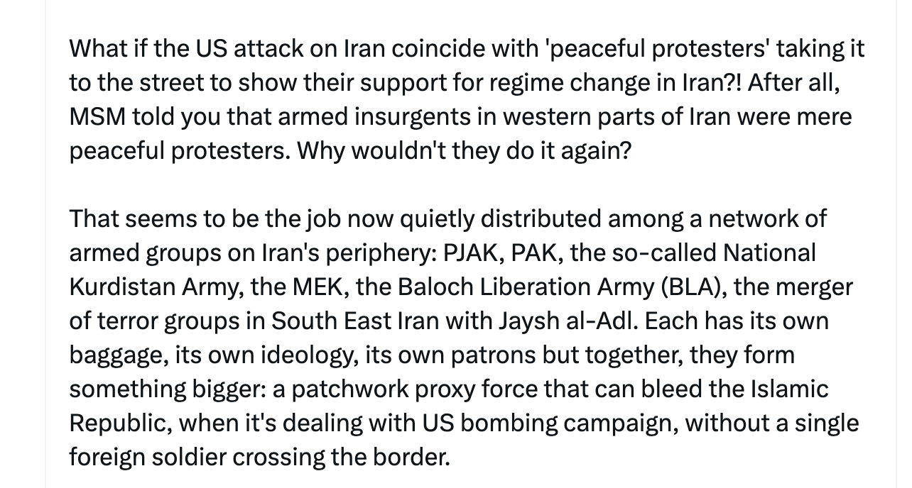The hybrid war front is building against Iran. This is not about a US-Israel kinetic war alone, it is far more sinister. The following screenshot is taken from a post on X by Iranian analyst Ehsan Safarnejad, my latest interview with him can be watched here: